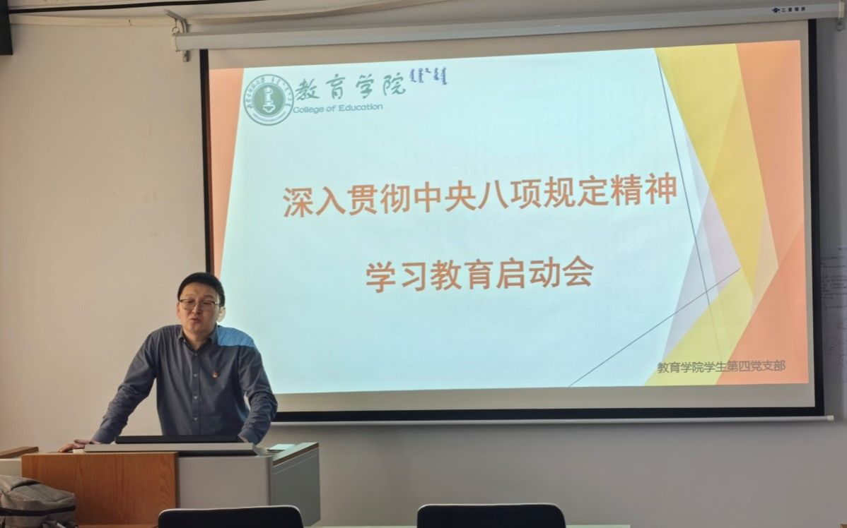 为深入贯彻落实中央八项规定精神,响应中共中央办公厅印发的《关于在全党开展深入贯彻中央八项规定精神学习教育的通知》的要求,350vip8888新葡的京集团学生第四党支部于3月27日在学院楼415教室召开深入贯彻中央八项规定精神学习教育启动会。会议由党支部书记斯琴满都呼主持,支部全体党员参加。