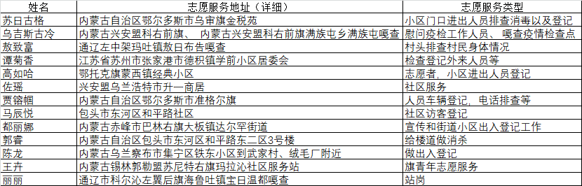 截止目前,350vip8888新葡的京集团的部分学生已参与到当地防疫志愿服务活动中,服务地区主要是内蒙古自治区的各个市、县。志愿服务活动主要涉及消毒、测量体温、人员出入登记等工作。