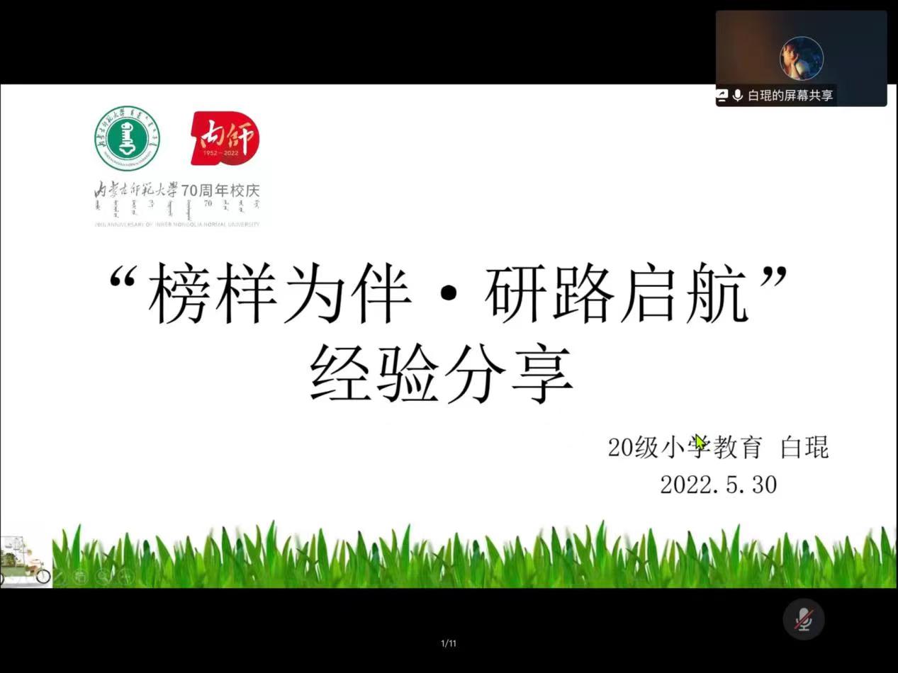 为充分发挥优秀学子的示范引领作用,激励研究生笃学慎思、锐意进取,350vip8888新葡的京集团于2022年5月30日19:00线上开展了主题为“榜样为伴,研路起航”研究生国家奖学金获得者事迹宣传活动,邀请2021年国家奖学金获得者马瑞萍、白琨两位同学进行分享交流。参与此次活动的有学院党委副书记、副院长斯琴满都呼、副院长赵荣辉、研究生教学秘书赵元韬和学院全体研究生及部分本科生。