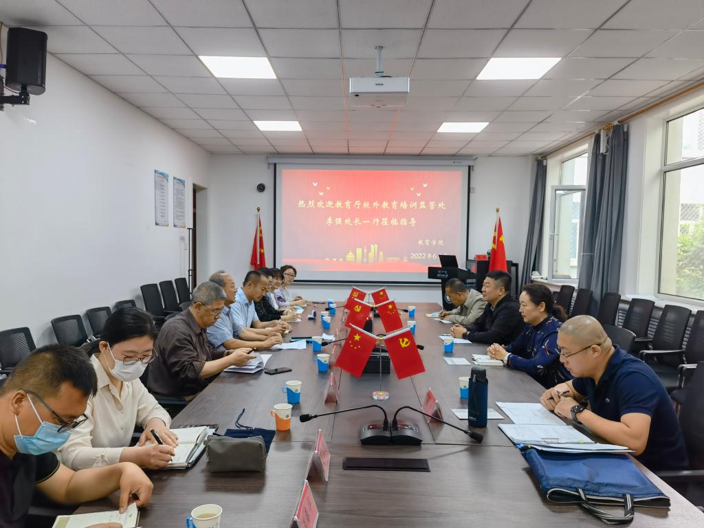 6月8日上午,自治区教育厅校外教育培训监管处李强处长,自治区教育厅基础教育处赵俊清副处长一行来院调研,与新葡的京官网党委副书记、院长米俊魁教授,副院长赵荣辉教授及学院部分教师座谈交流,座谈会由米俊魁主持。双方就进一步深化在“双减”政策落地实施与效果评估、“家—校—社”协同育人机制创新等方面的合作进行了深入探讨,初步拟定了部分合作事项。