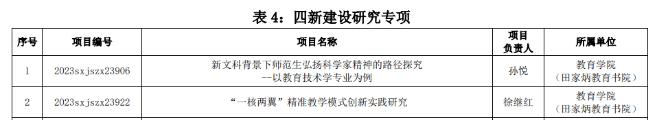 新葡的京官网师范类专业研究专项获批7项、四新建设研究专项获批2项、课程思政研究专项获批2项、数字化建设研究专项获批1项、其他与学校发展现实相结合的校本研究项目获批1项。